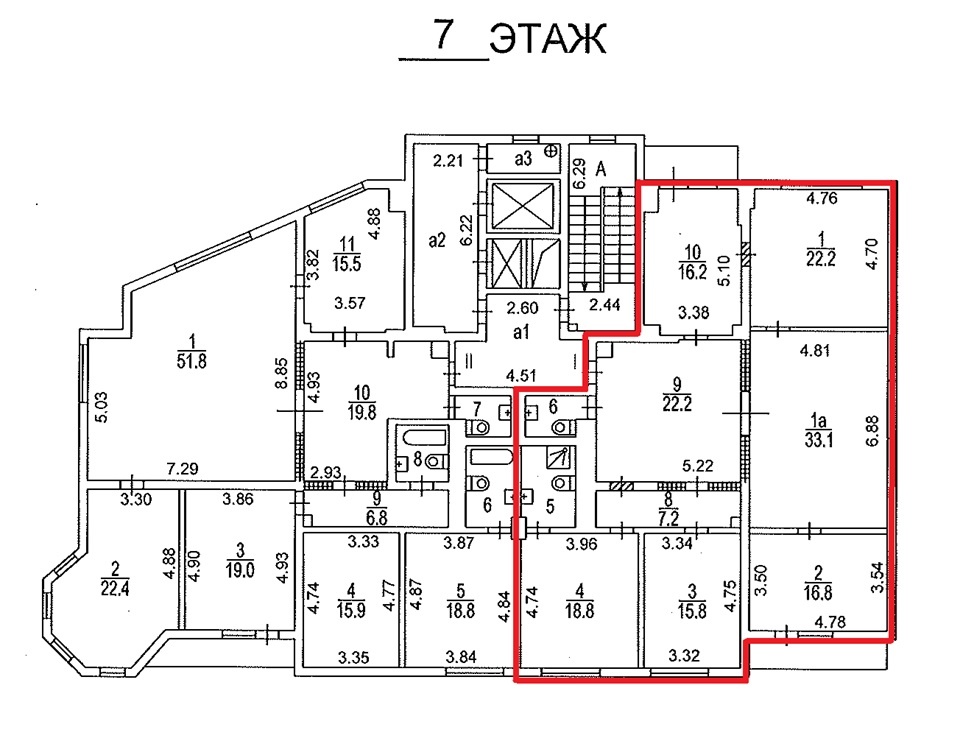 Кабинетная планировка: шесть кабинетов, рецепшен, кухня и два сан.узла