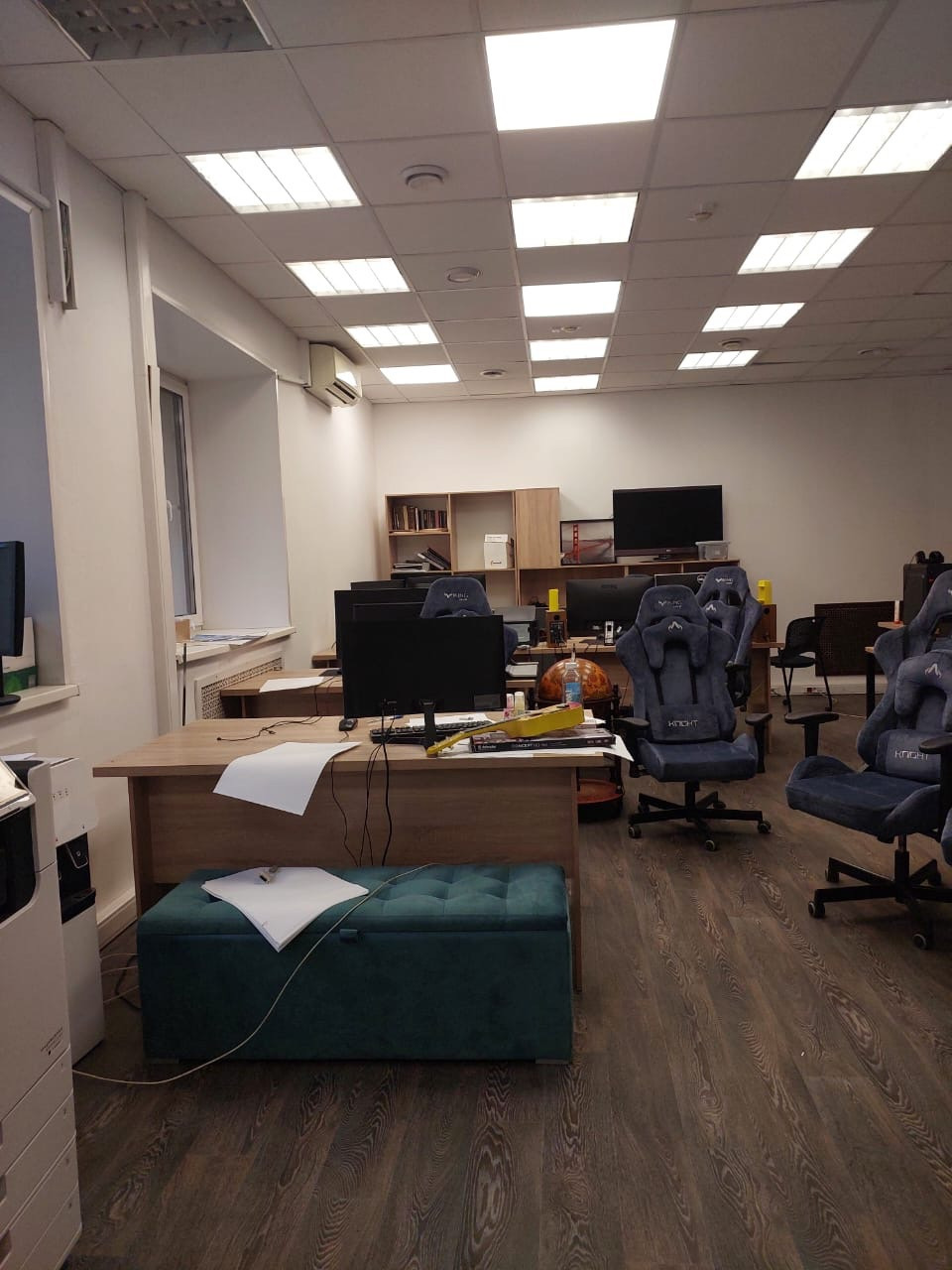 Планировка: кабинеты 33, 38, 6 кв.м, два больших кабинета по 50 кв.м., переговорная, кухня, 2 туалета.